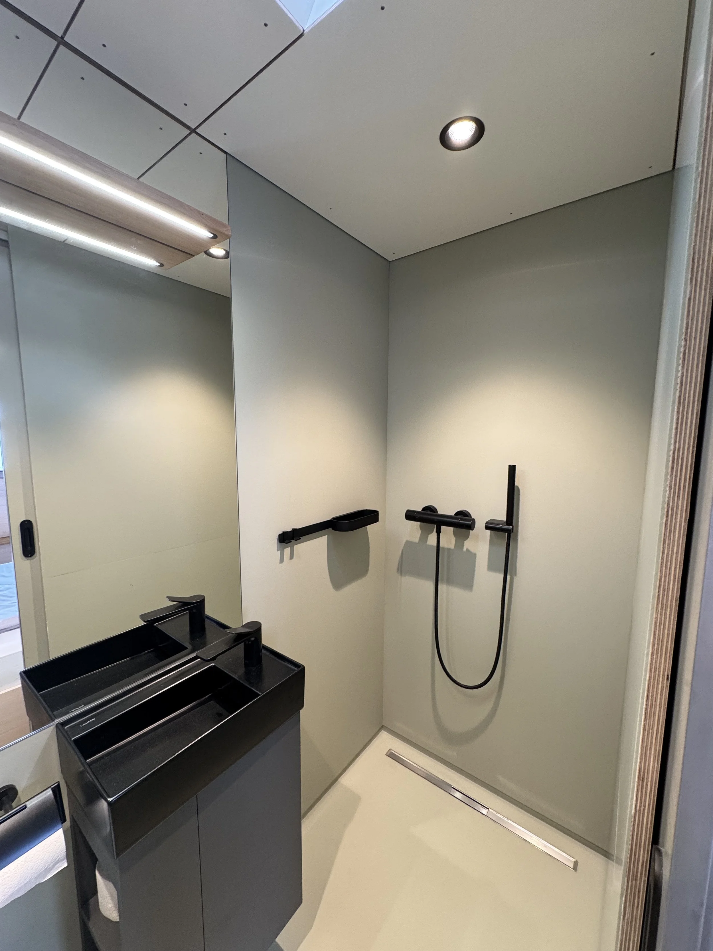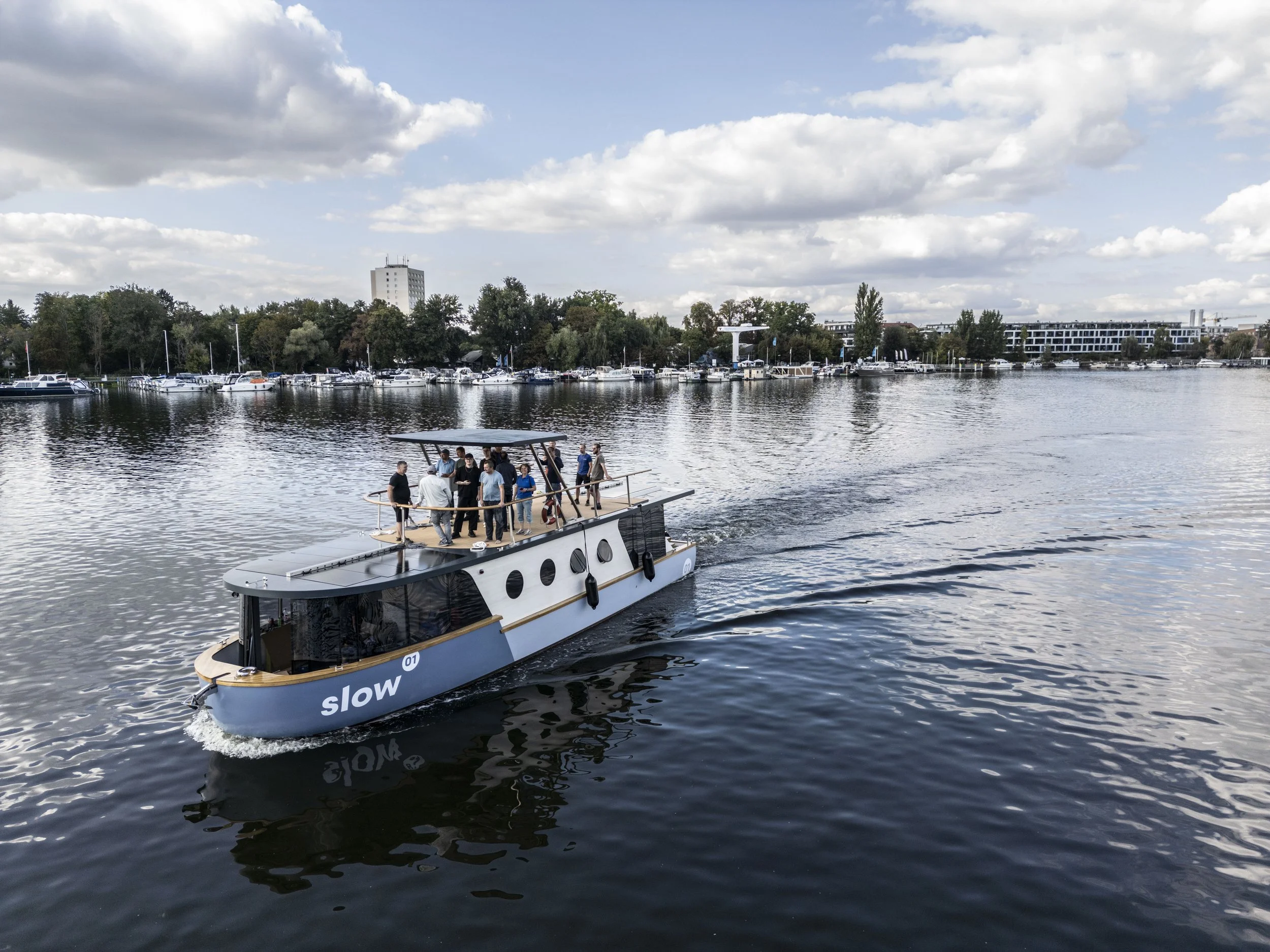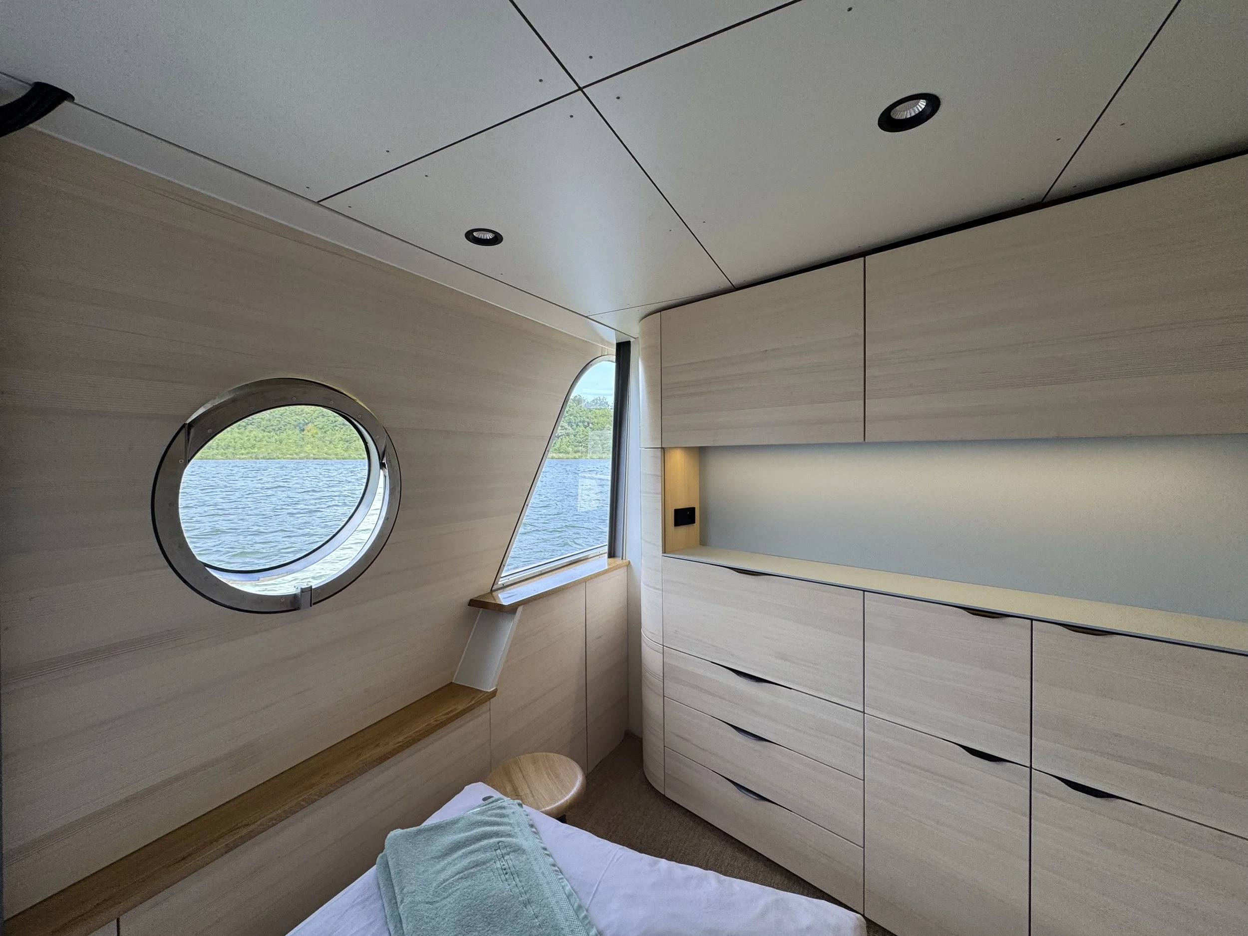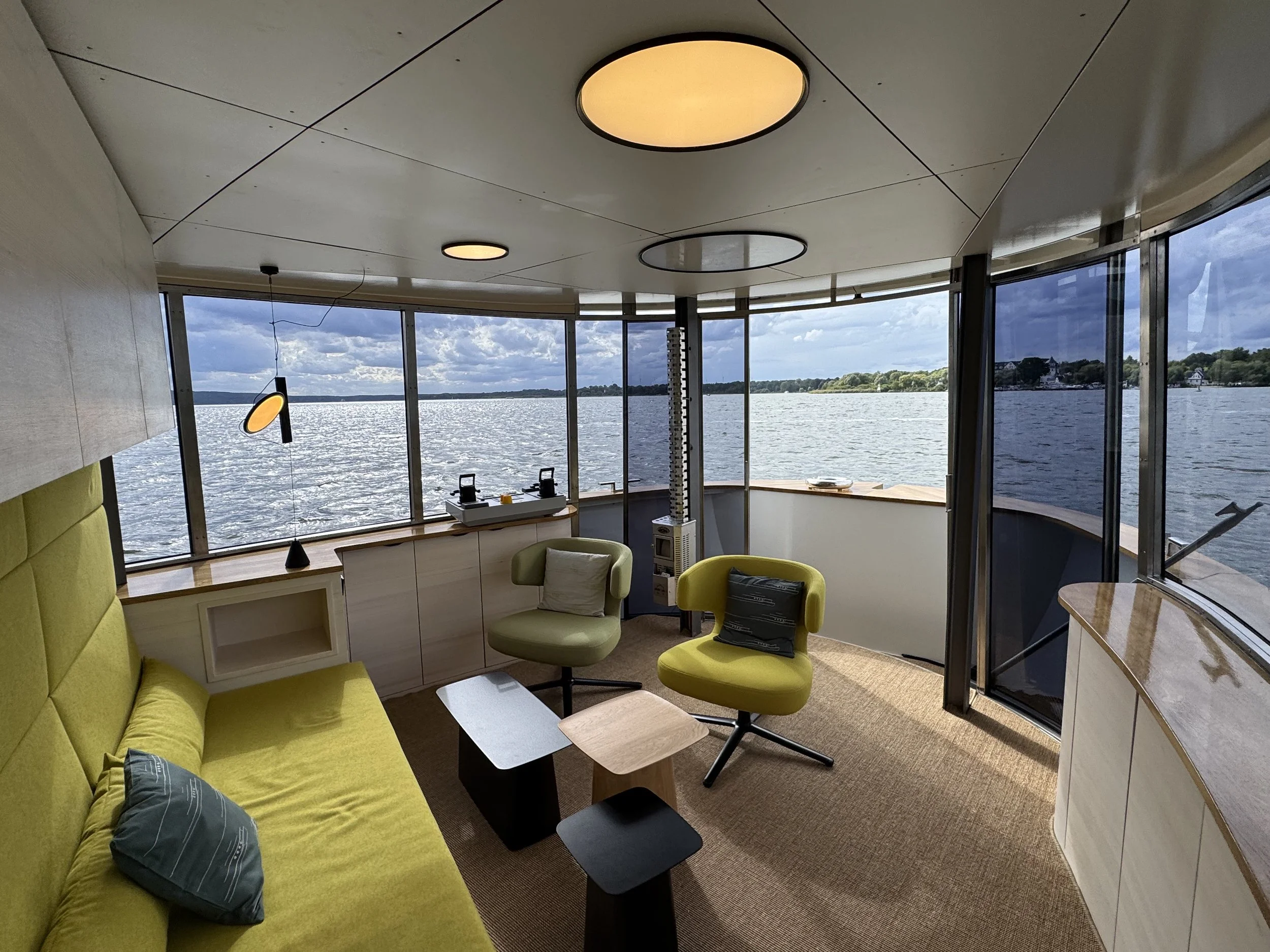 Dieses Schiff verbindet Wohnen und Reisen auf europäischen Binnengewässern – nachhaltig und innovativ. Zwei drehbare E-Antriebe ermöglichen per Joystick präzises Manövrieren, während großflächige Photovoltaikmodule den Energiebedarf decken. Rumpf und Innenausbau bestehen vollständig aus massiver Weißtanne aus dem Schwarzwald