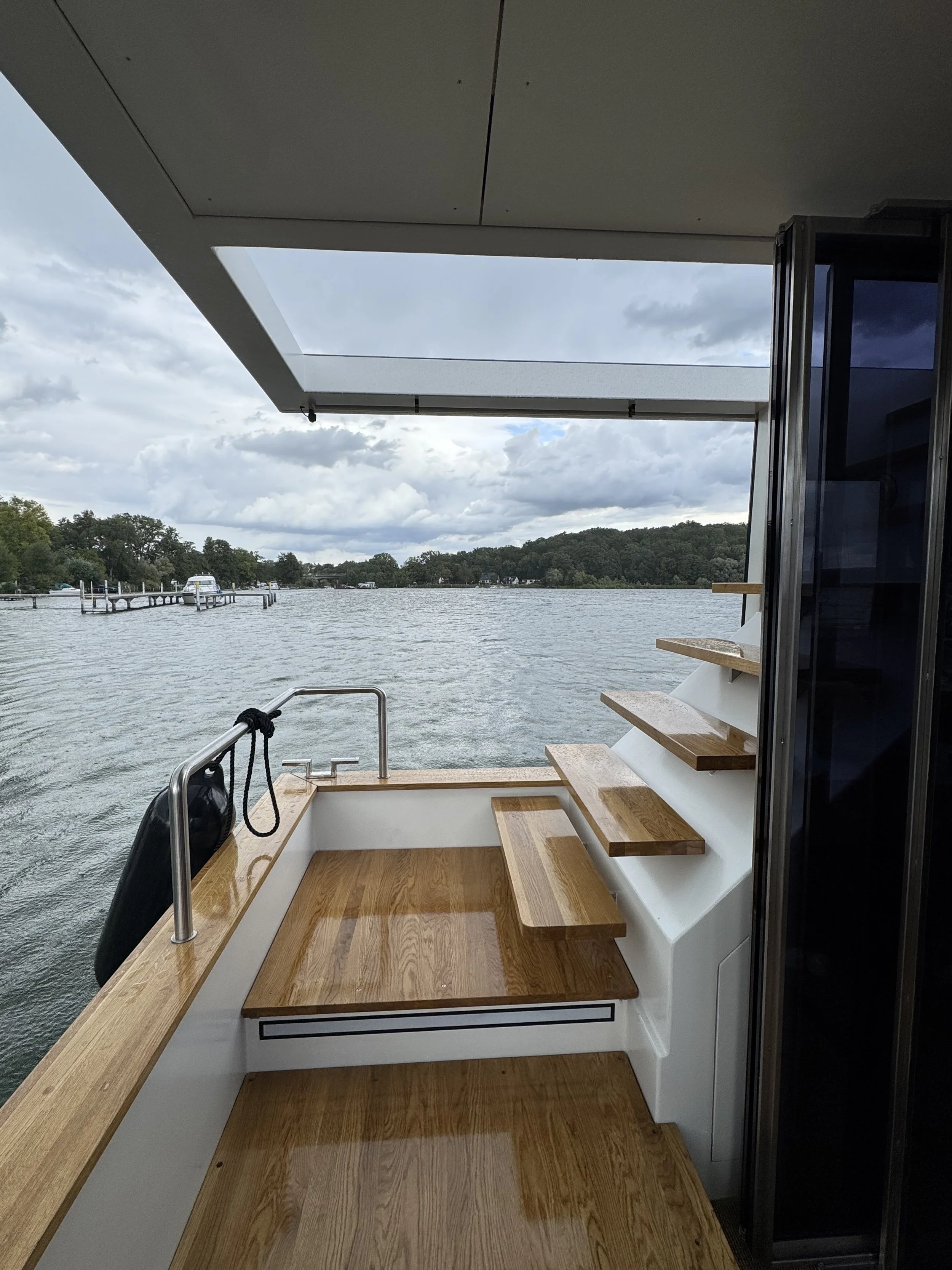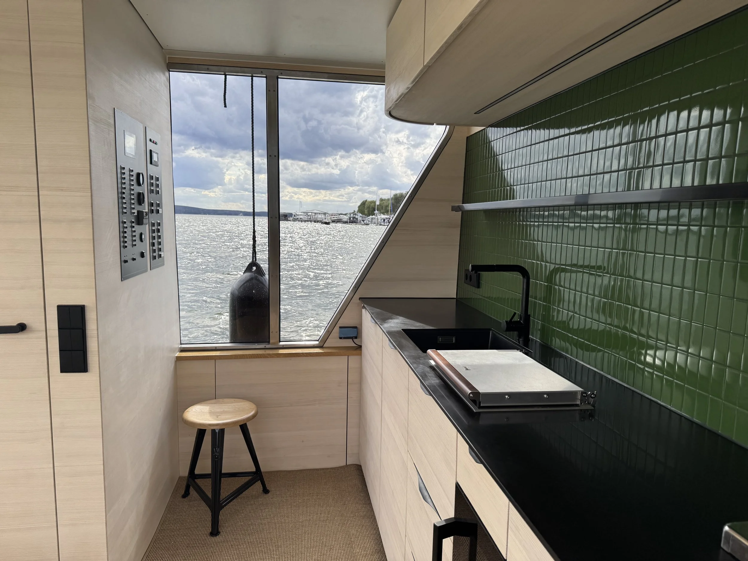 Dieses Schiff vereint Wohnen und Reisen auf europäischen Binnengewässern und trifft auch hinsichtlich ökologischer Aspekte den Nerv der Zeit. Große Photovoltaik Flächen sorgen für ausreichenden Aktionsradius. Das Baumaterial stellt einen Bezug zur Heimat des Auftraggebers her. So wird der gesamte Rumpf und Innenausbau aus massiver Weisstanne aus dem Schwarzwald gefertigt.
